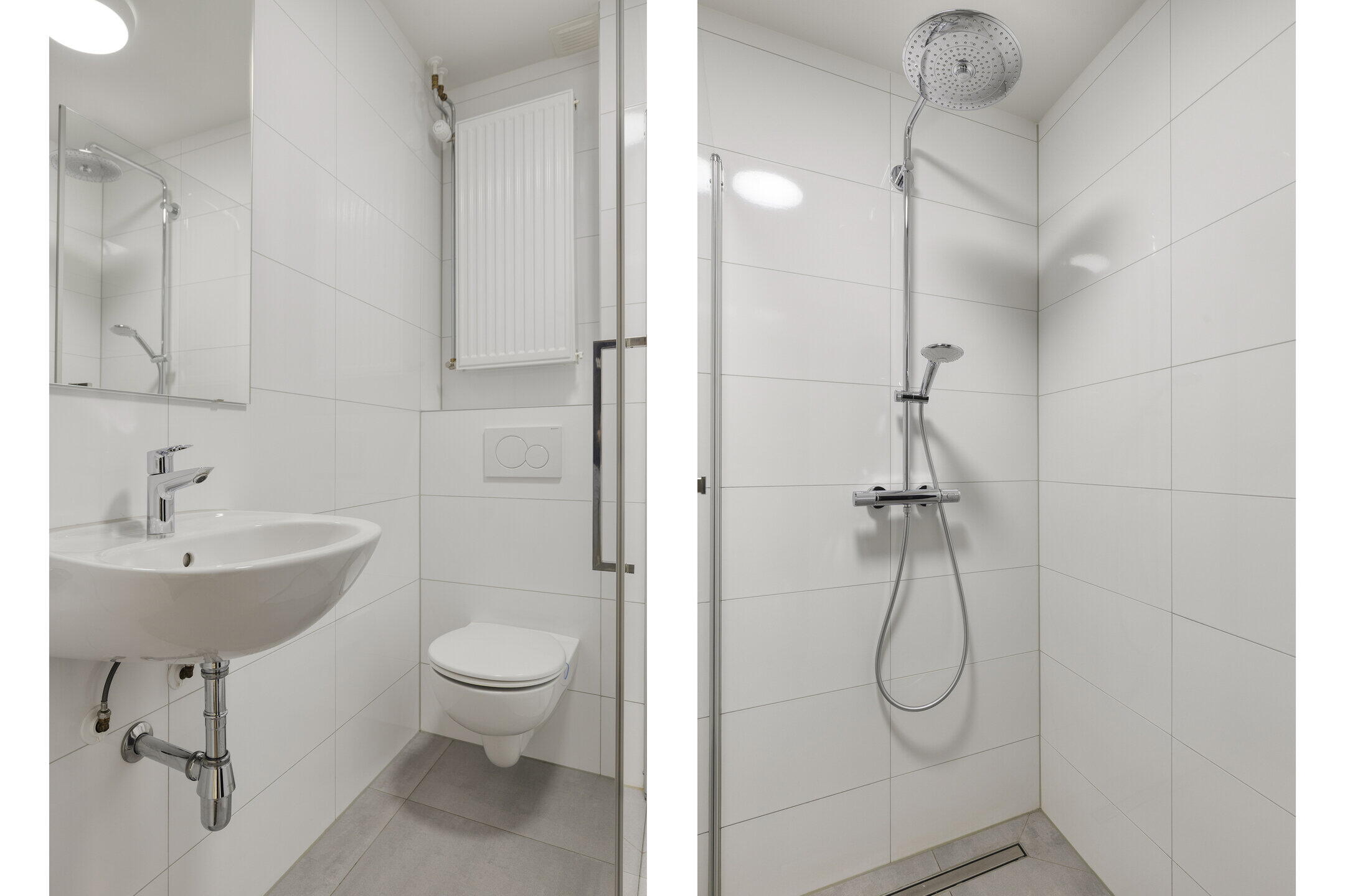 De badkamer is licht betegeld, beschikt over een inloopdouche, wastafel en tweede toilet.
