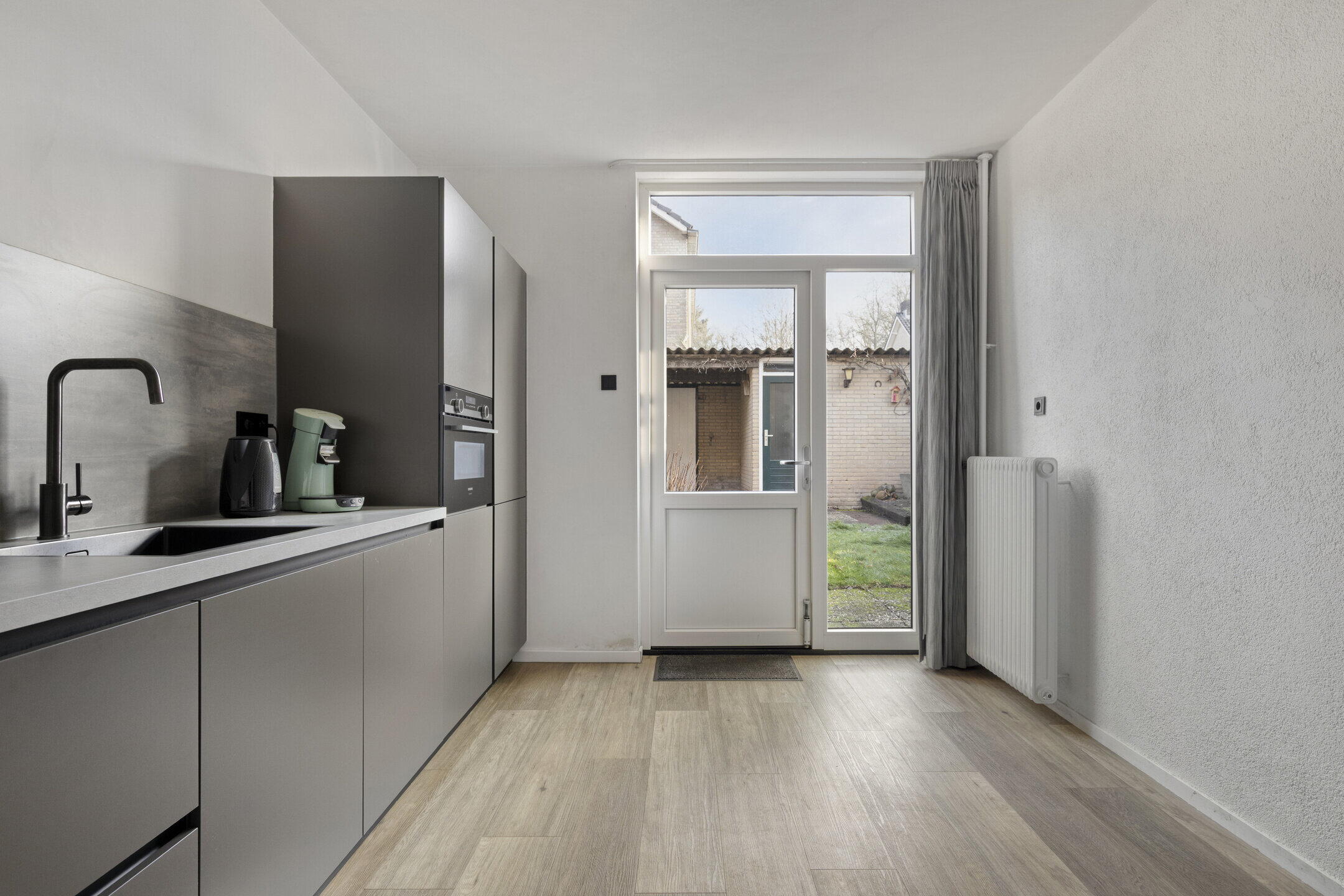 De dichte keuken is ruim en biedt naast de keukenopstelling met ingebouwde inductie kookplaat, afzuigkap, combioven, koelkast, vriezer én vaatwasser, ruimte voor een eettafel. De keuken beschikt over een eigen warmwater voorziening via close-in boiler.